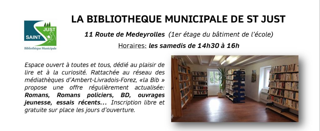 LA BIBLIOTHEQUE MUNICIPALE DE SAINT-JUST (1er étage du bâtiment de l’école), 11 route Médeyrolles Horaires : Les samedis…