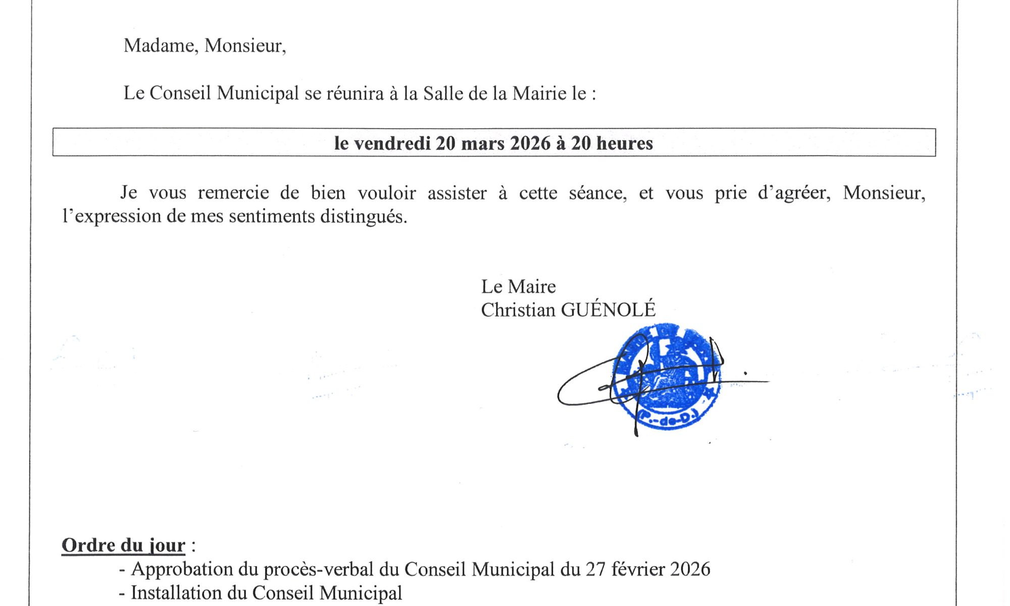 Ce vendredi 20 mars 2026 a eu lieu l’installation du nouveau conseil municipal :
